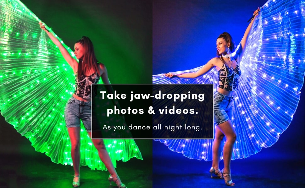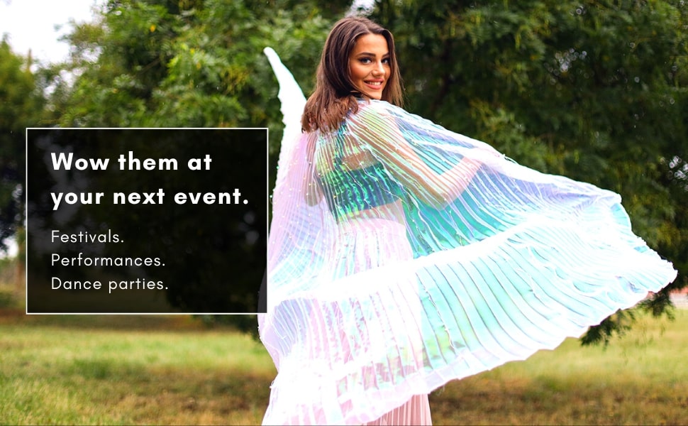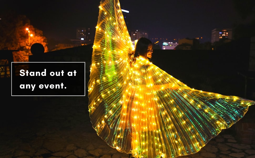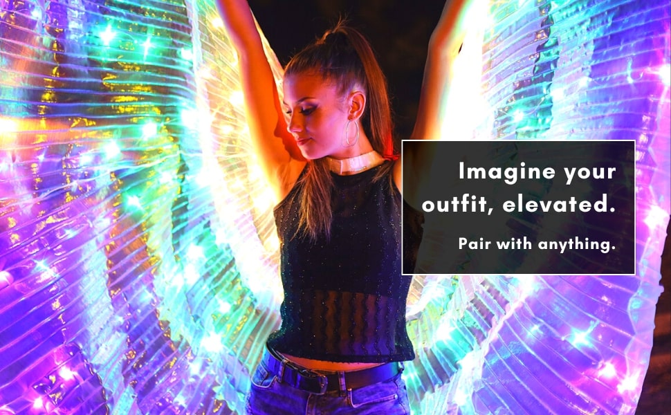With solid and blinking light modes, you can easily control the dazzling effects with the built-in hand button as you dance the night away. Plus, our adjustable wingspan allows for the perfect fit and comfort.